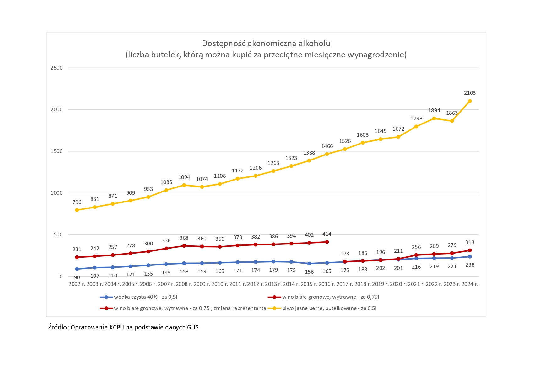 • piwo: 2103 butelek 0,5 l; dostępność ekonomiczna piwa zmniejszyła się w porównaniu z rokiem 2022 o 31 butelek (spadek o 1,64%); (w 2023 r. – 1863 butelek)