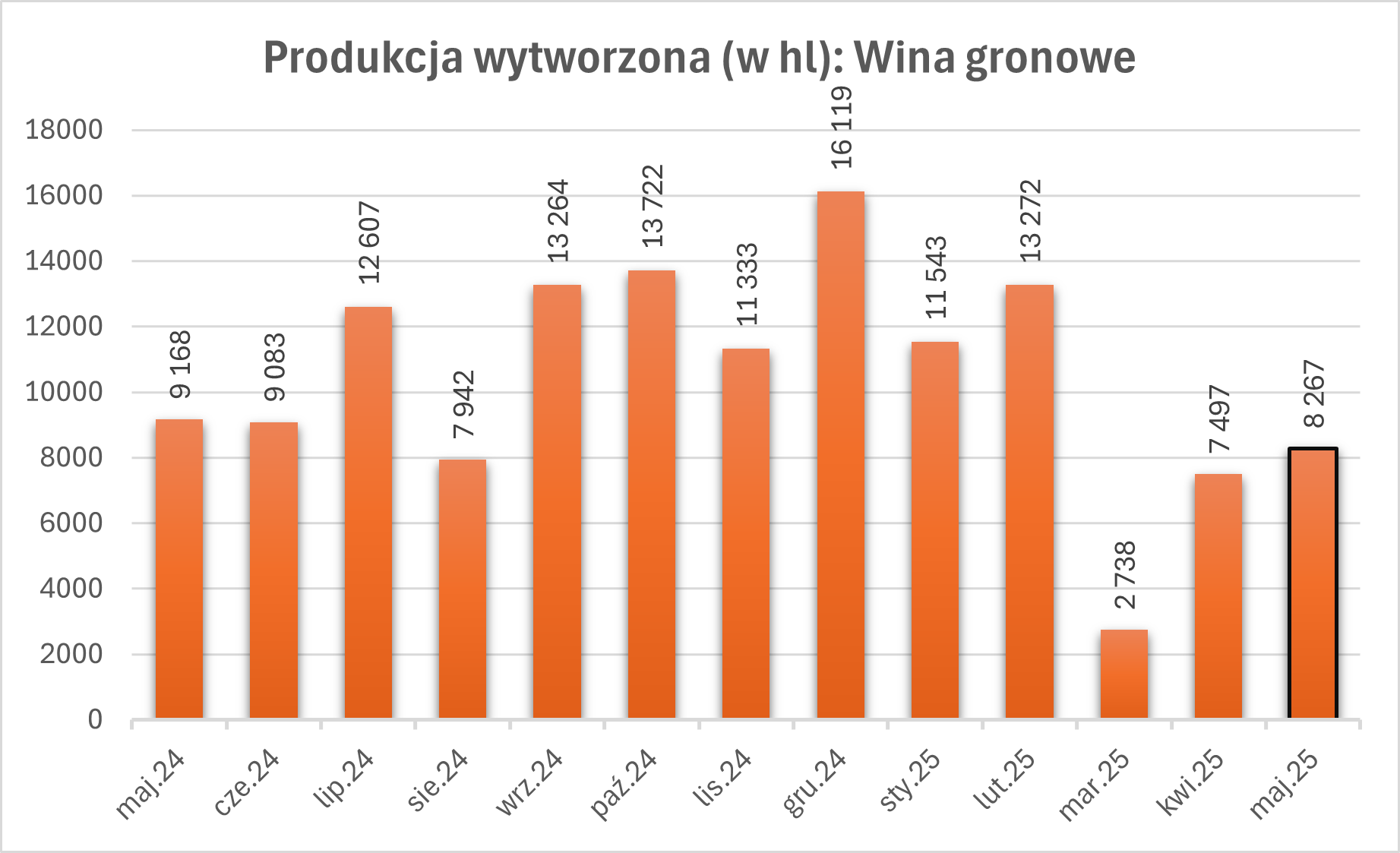 Wina gronowe: Sprzedaż wina gronowego w maju 2025 r. wyniosła 6 289 hl, co stanowi o 13% mniej niż w maju 2024 r.