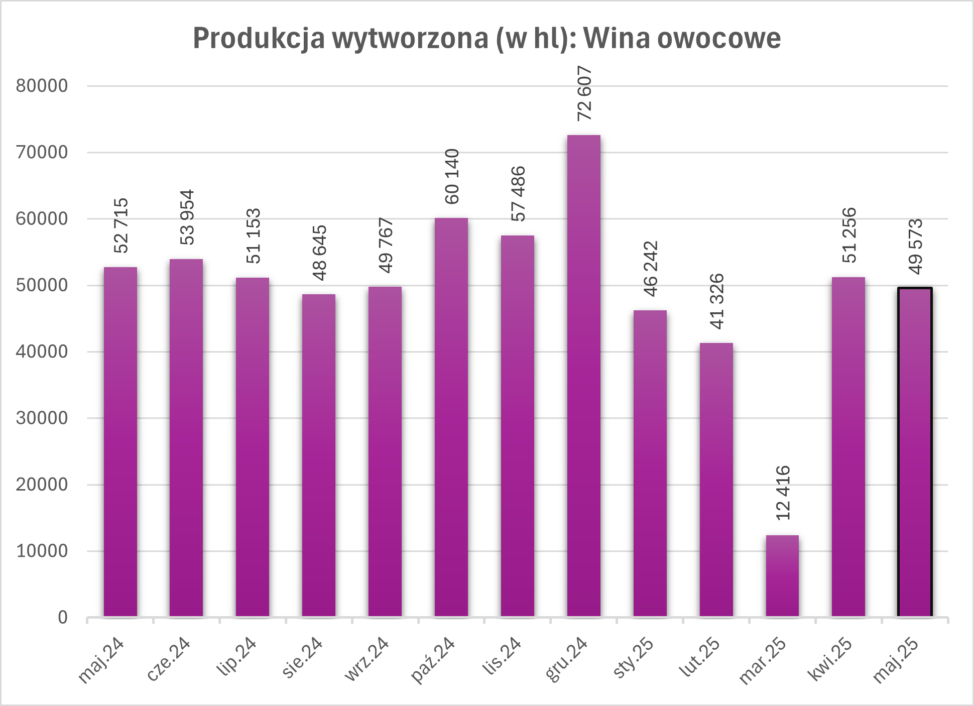 Wina owocowe: Produkcja wina owocowego w maju 2025 r. wyniosła 49 573 hl, co stanowi o 6% mniej niż w maju 2024 r.