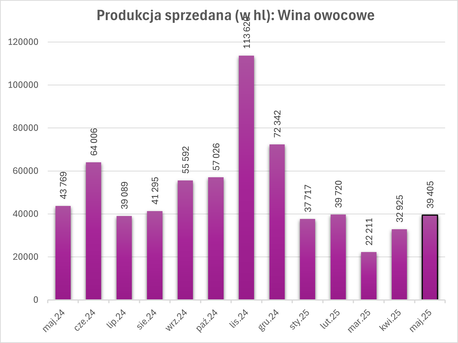 Wina owocowe: Sprzedaż wina owocowego w maju 2025 r. wyniosła 39 405 hl, co stanowi o 10% mniej niż w maju 2024 r.