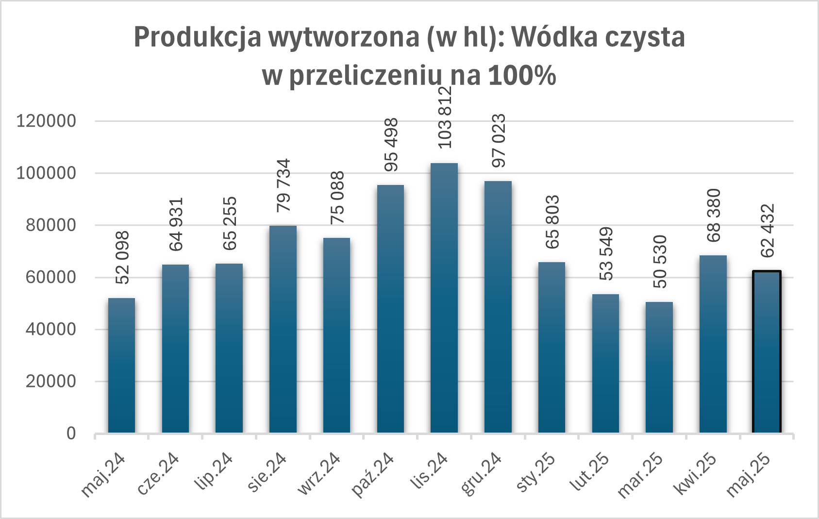 Wódka czysta w przeliczeniu na 100%: Produkcja wódki w maju 2025 r. wyniosła 62 432 hl, co stanowi o 20% więcej niż w maju 2024 r.