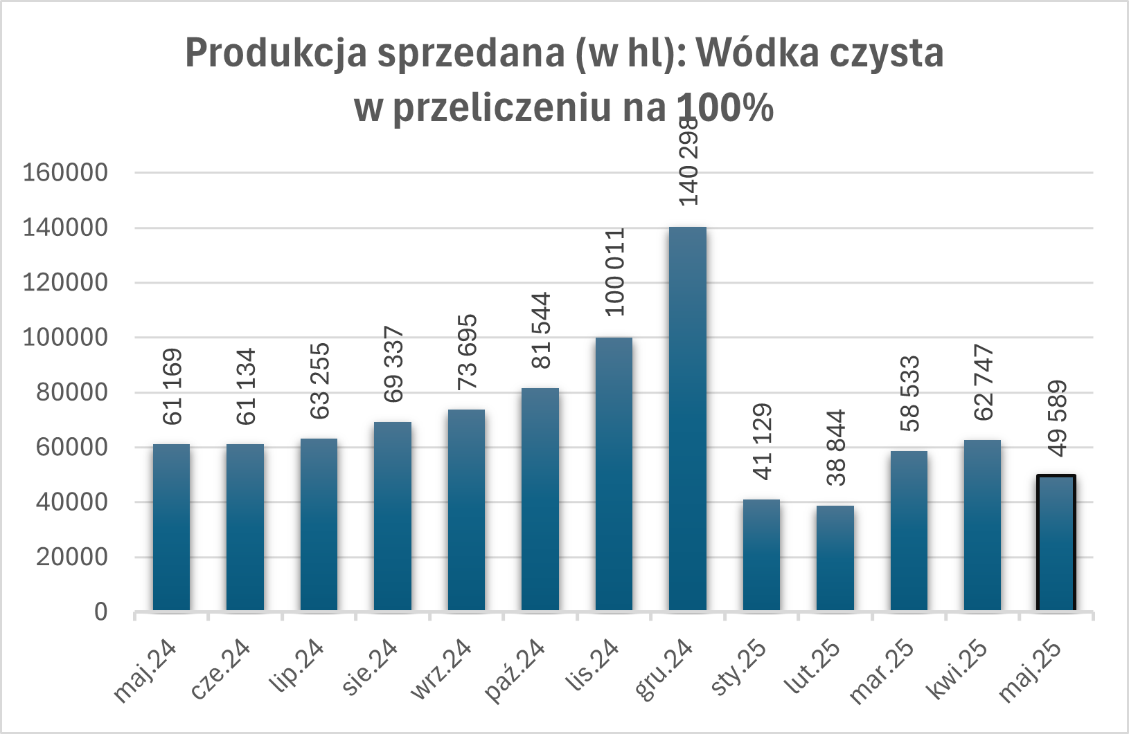 Wódka czysta w przeliczeniu na 100%: Sprzedaż wódki w maju 2025 r. wyniosła 49 589 hl, co stanowi o 19% mniej niż w maju 2024 r.