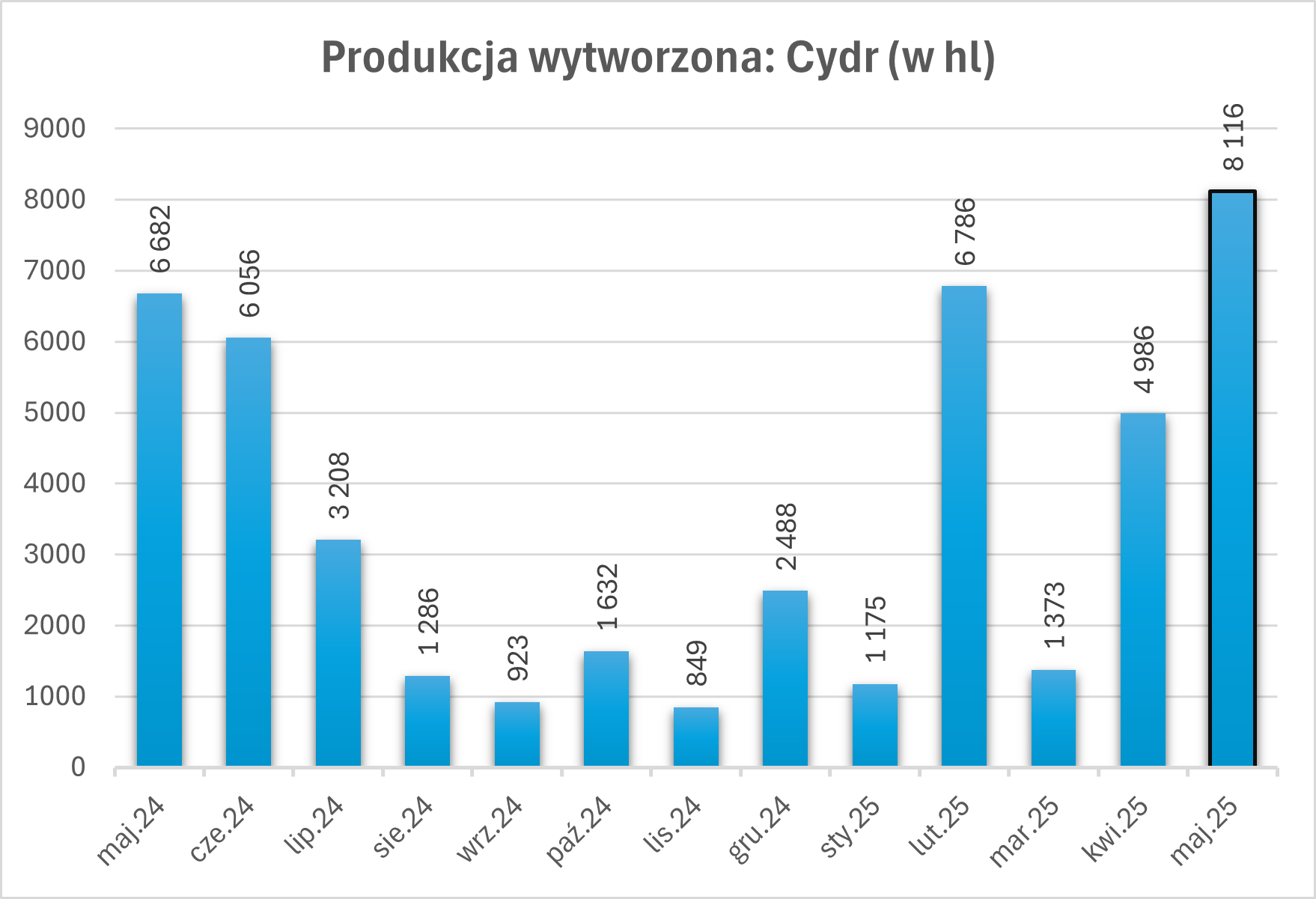 Cydr: Produkcja cydru w maju 2025 r. wyniosła 8 116 hl, co stanowi o 21% więcej niż w maju 2024 r.