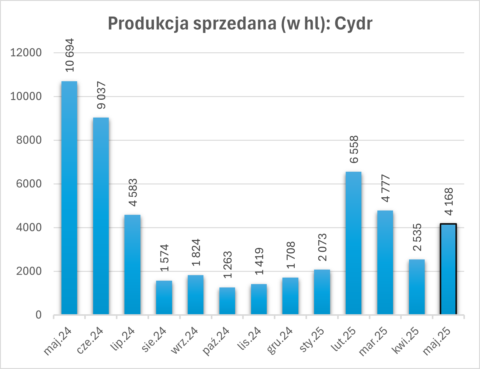 Cydr: Sprzedaż cydru w maju 2025 r. wyniosła 4 168 hl, co stanowi o 61% mniej niż w maju 2024 r.