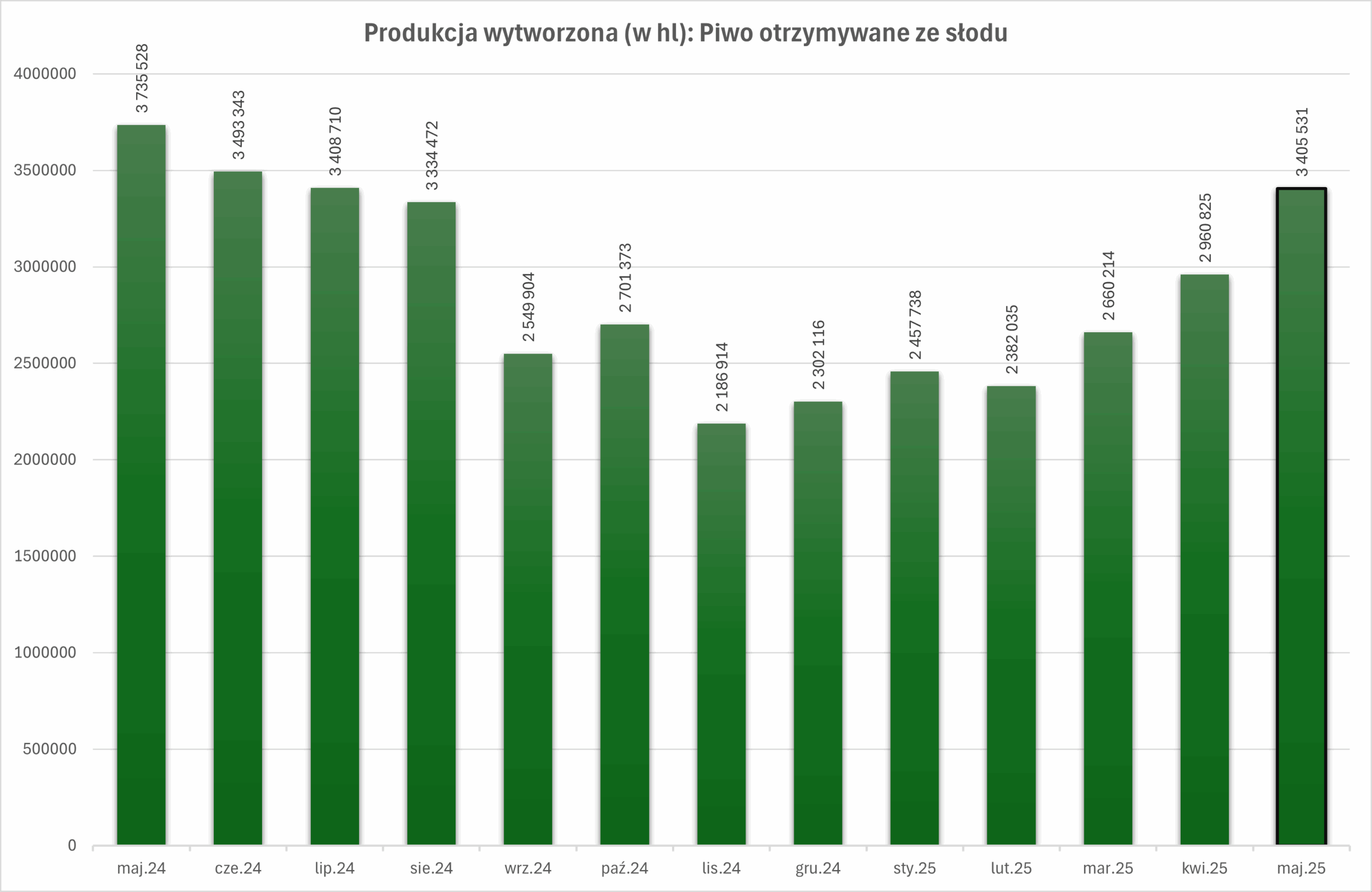 Piwo alkoholowe (powyżej 0,5%): Produkcja piwa w maju 2025 r. wyniosła 3 405 531 hl, co stanowi o 9% mniej niż w maju 2024 r.
