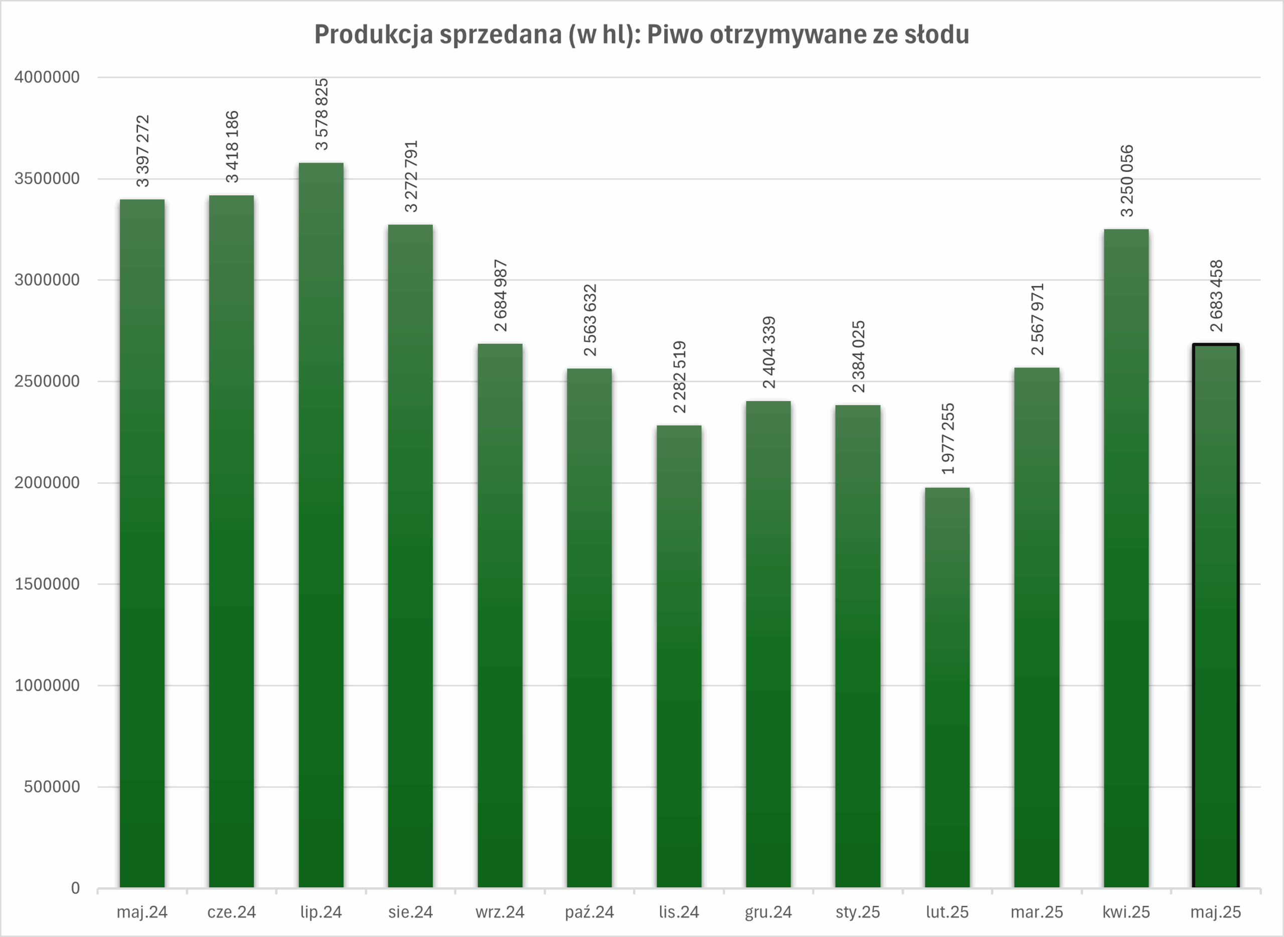 Piwo alkoholowe (powyżej 0,5%): Sprzedaż piwa w maju 2025 r. wyniosła 2 683 458 hl, co stanowi o 21% mniej niż w maju 2024 r.