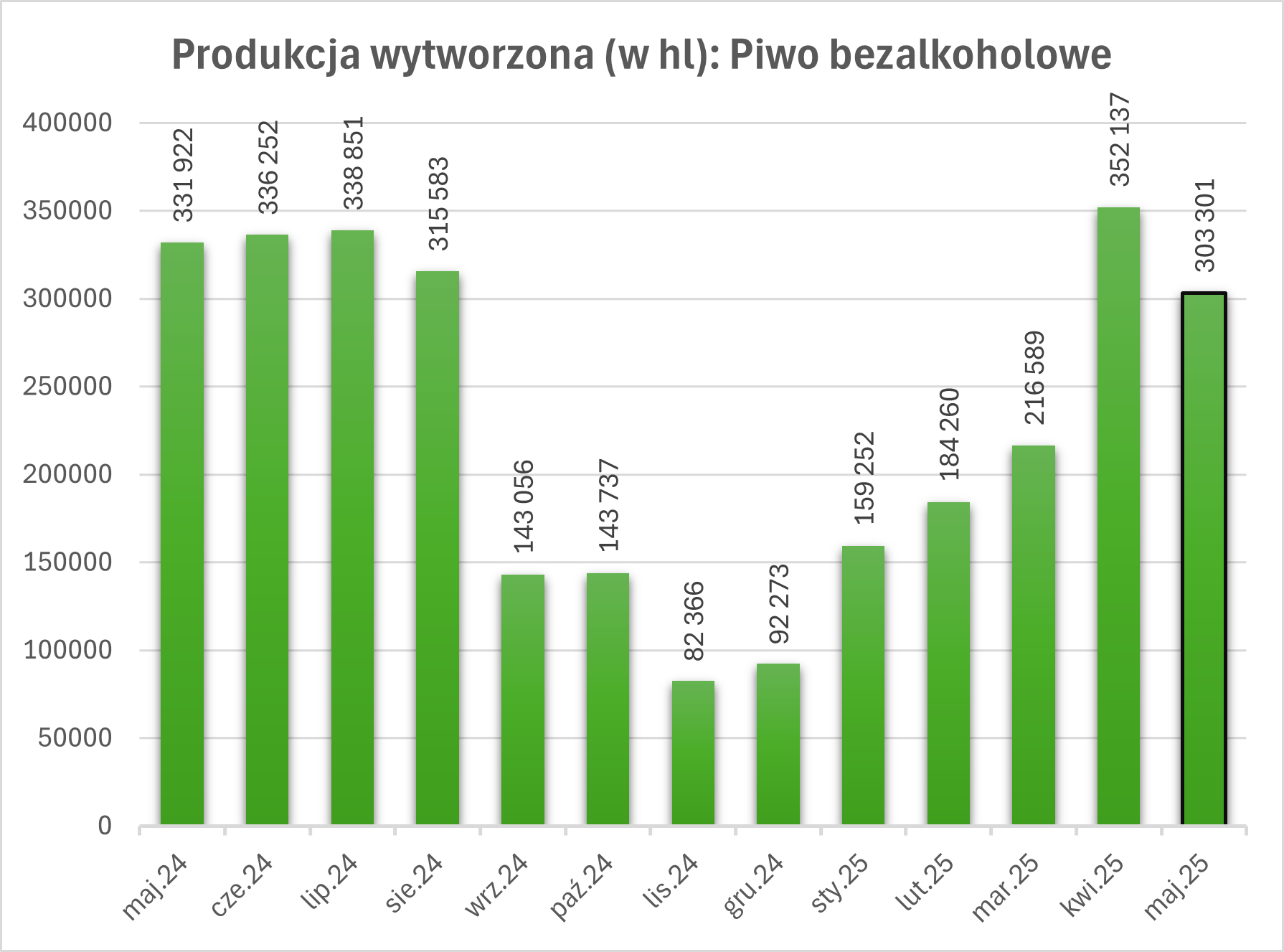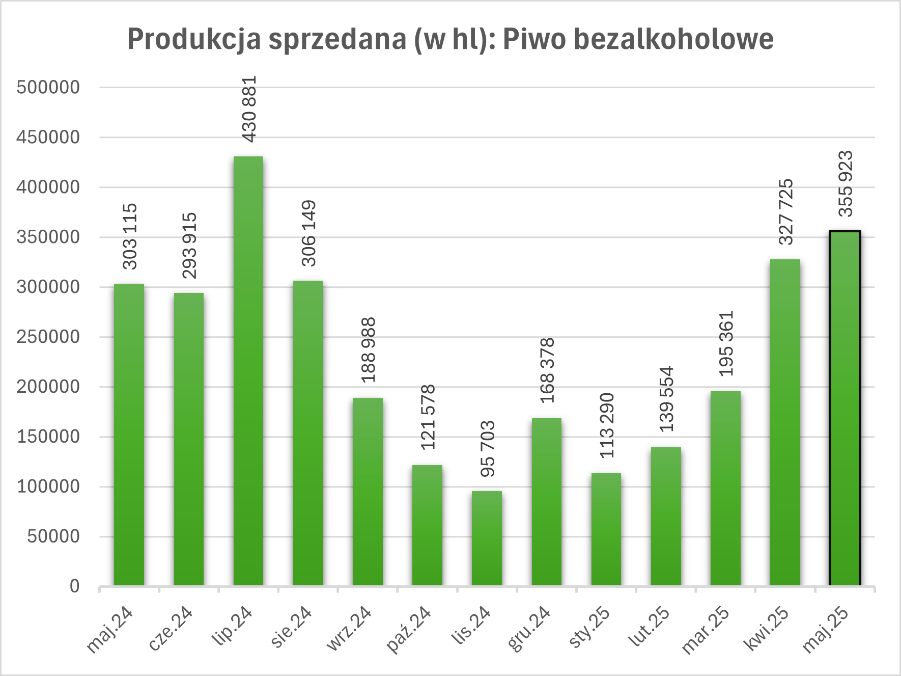Piwo bezalkoholowe (do 0,5%): Sprzedaż piwa bezalkoholowego w maju 2025 r. wyniosła 355 923 hl, co stanowi o 17% więcej niż w maju 2024 r.