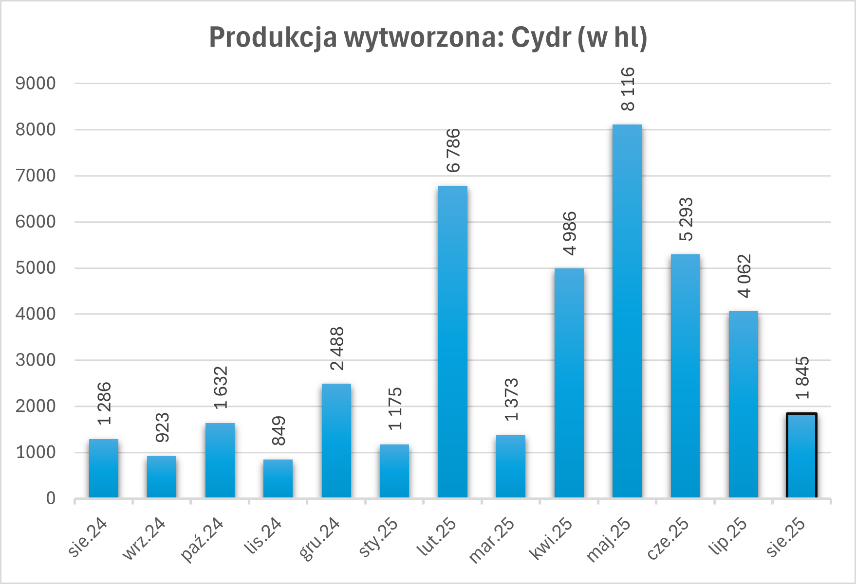 Cydr: Produkcja wyniosła 1 845 hl, co oznacza wzrost o 43% w porównaniu z sierpniem 2024 r.