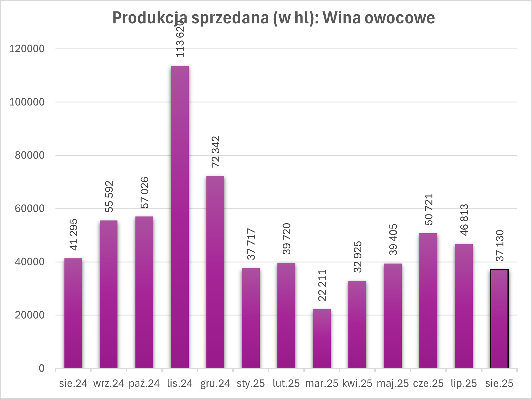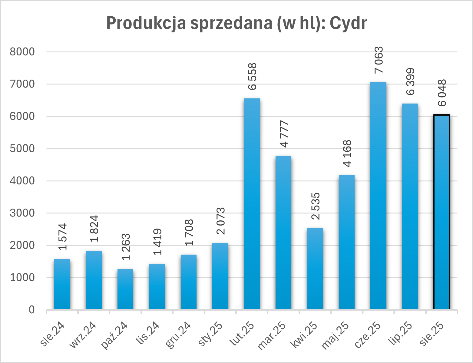 Cydr: Sprzedaż wyniosła 6 048 hl, co oznacza wzrost o 284% w porównaniu z sierpniem 2024 r.
