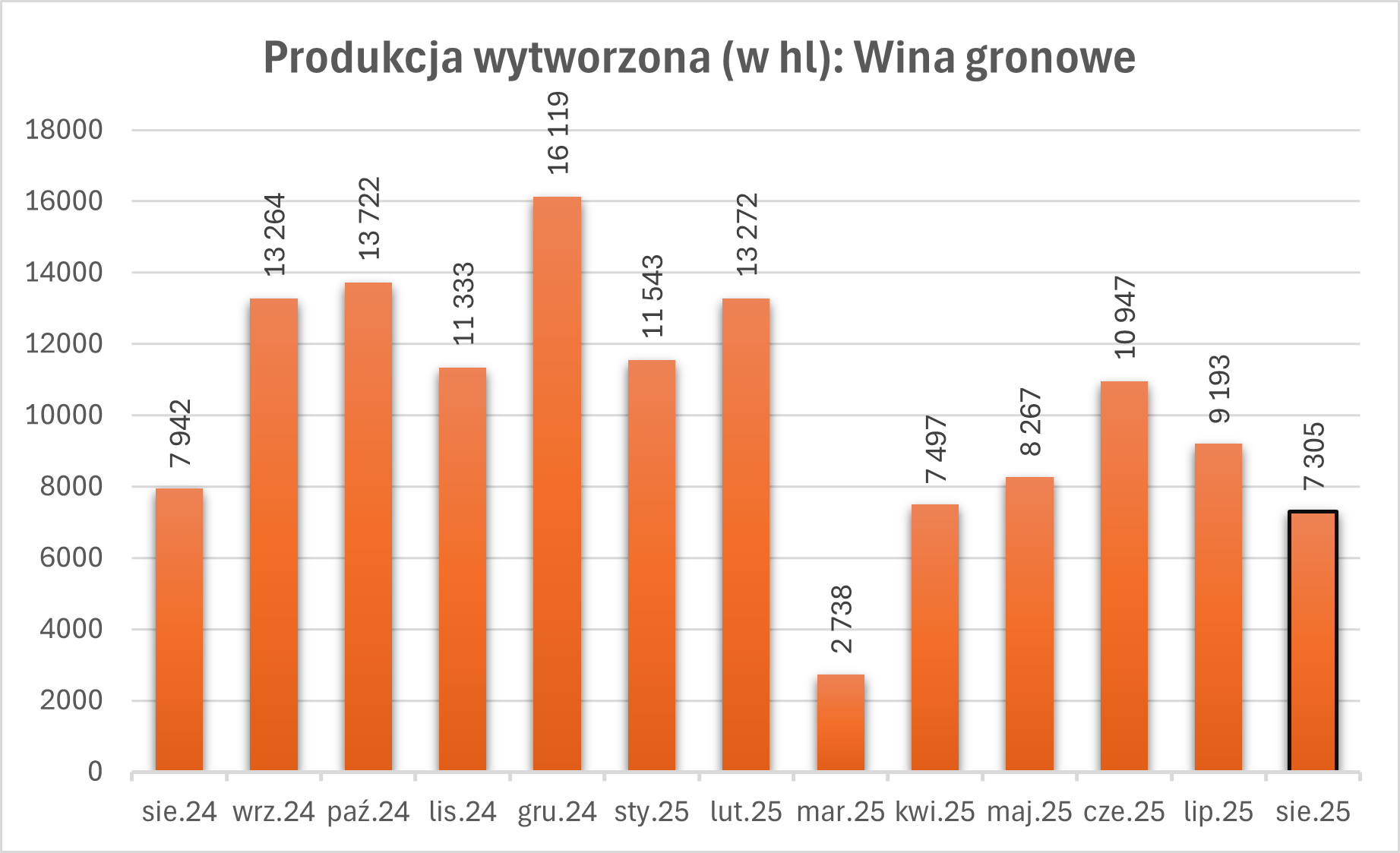 Wina gronowe: Produkcja  wyniosła 7 305 hl, czyli o 8% mniej niż rok wcześniej.