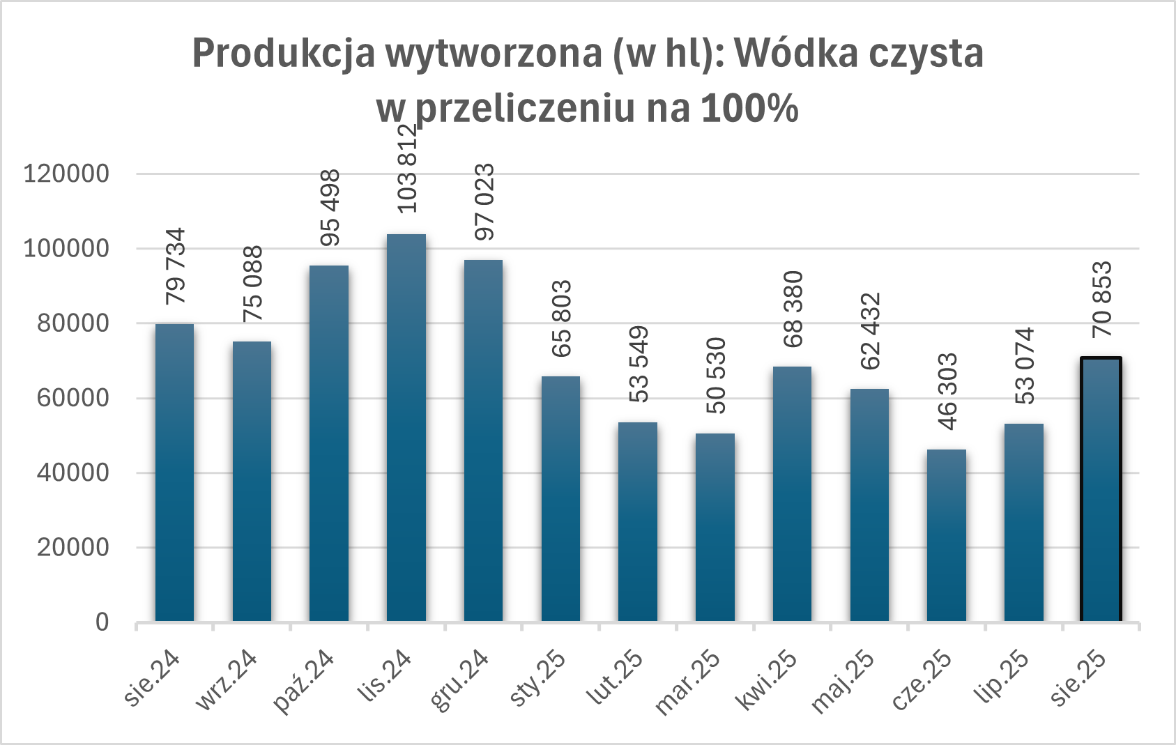 Wódka czysta w przeliczeniu na 100%: Produkcja wyniosła 70 853 hl, co stanowi o 11% mniej niż w sierpniu 2024 r.