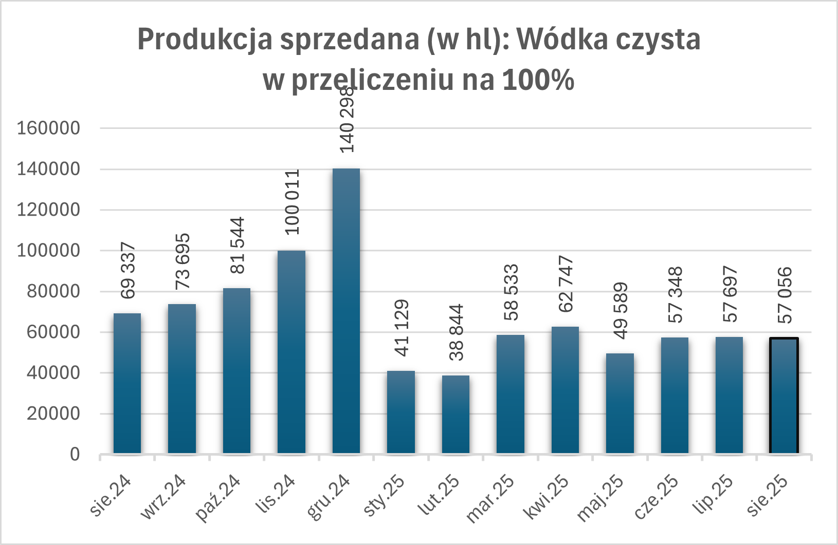 Wódka czysta w przeliczeniu na 100%: Sprzedaż wyniosła 57 056 hl, co stanowi o 18% mniej niż w sierpniu 2024 r.