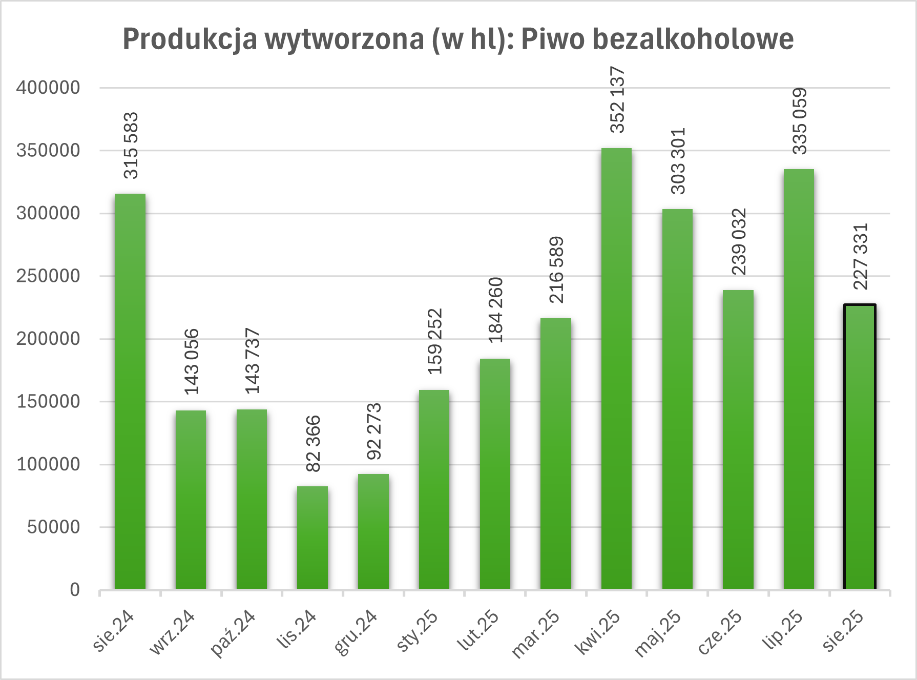 Piwo bezalkoholowe (do 0,5%): Produkcja wyniosła 227 331 hl, co oznacza spadek o 28% r/r.