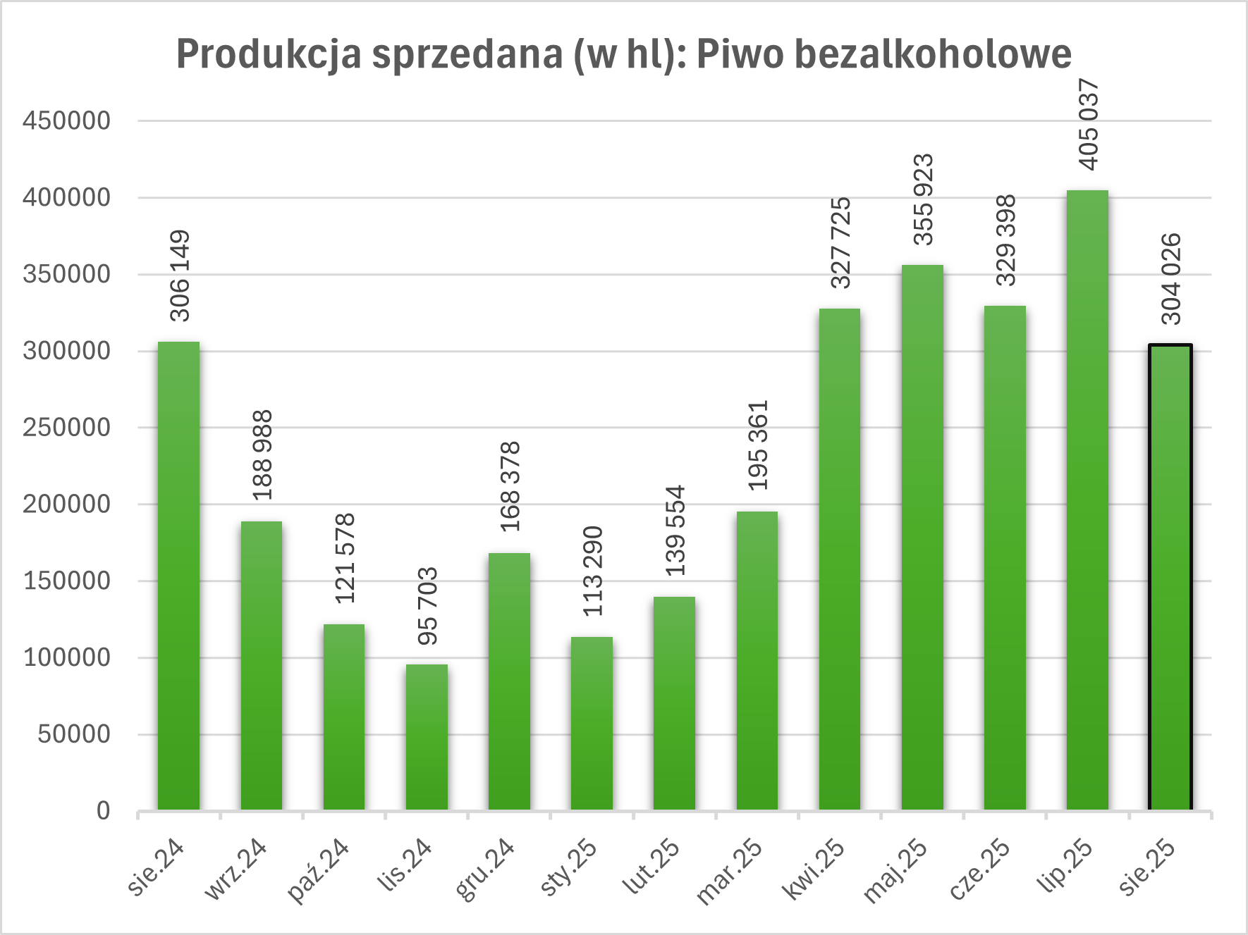 Piwo bezalkoholowe (do 0,5%): Sprzedaż wyniosła 304 026 hl, co oznacza wzrost o 1% r/r.