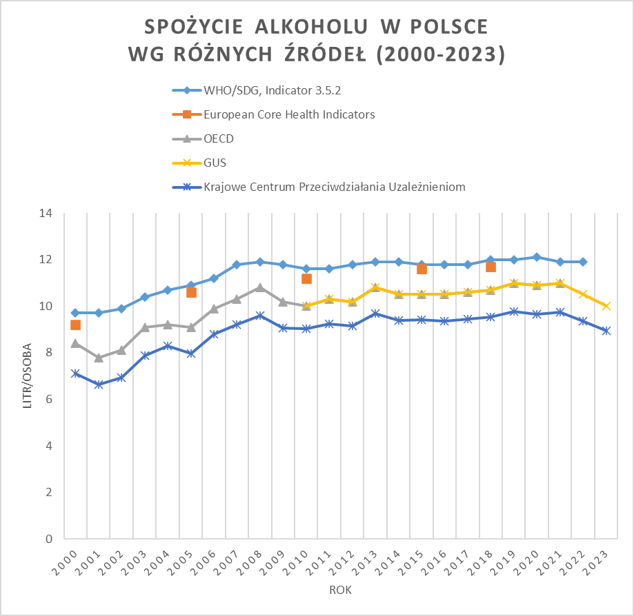 Podobny obraz rysują informacje, których dostarcza Światowa Organizacja Zdrowia (wskaźnik SDG Indicator 3.5.2 według The Global Health Observatory oraz United Nations Economic Commission for Europe)2. Zgodnie z nimi konsumpcja alkoholu w Polsce w ciągu ponad 20 lat wahała się między 9,7 l (2000 r.) a 11,9 l (2022 r.) czystego alkoholu per capita. Szczytowym momentem okazał się rok 2020, kiedy to spożycie wyniosło 12,1 l/os., później, podobnie jak w statystykach KCPU, notuje się spadek. Różnica w poziomie spożycia wynika z zastosowanej metodologii – w przypadku KCPU podstawą do przeliczenia była cała populacja Polski, a dla United Nations Global SDG populacja w wieku 15+, a więc mniejsza grupa, co przełożyło się na wyższy wskaźnik per capita.
